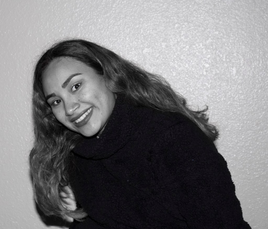 This is my friend Karla; however, she is more like a sister to me. We both weren’t sure how to take the picture and therefore, she just began to pose. During this picture her son was next to her copying her on how she was posing. This photo reflects her personality of always having a big smile on her face, even when life knocks her down she stays strong. I took this photo on Tuesday evening in her apartment, posing in front of a white wall in her living room.